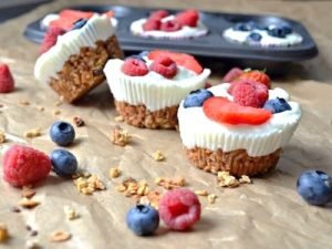 Otra opción son las tartas a base de granola mezclada con crema de almendras y encima yogurt natural sin azúcar con fruta fresca. Los coloresmorados y rojos son muy atractivos a la vista, y es que los frutos rojos así como todas las variantes de bayas son excelente opciónpor ser de bajo índice glucémico, ricos en potasio, altos en fibra, y sobre todo ricos en polifenoles que es un antioxidante natural que tiene múltiples beneficios, entre ellos protegernos de la oxidación solar, y claro delicioso sabor.