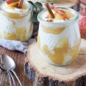 Y una novedad para mí, es el tiramisú de manzana. Adapté esta receta a mi familia. Lo que tenemos que hacer es en tazón grande mezclar 250 g de queso mascarpone, 250 g de requesón o yogurt griego, y 3 cdtas de azúcar (opcional), con un chorrito de esencia de vainilla y batir hasta que quede cremoso. Si usamos frascos individuales podemos añadir compota de manzana casera, trozos de nueces o granola y después verter con cuidado la mezcla de queso y espolvorear con canela, dejar refrigerar al menos 4 horas para que quede firme. Una variante es usar mango o frambuesas en lugar de manzana.